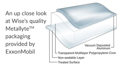 ReadyWise utilizza un film ad altissima barriera per il suo imballaggio chiamato polipropilene metallizzato orientato (OPP) Metallyte™. Questo film è progettato per fornire una protezione ottimale per prodotti sensibili all’ossigeno e all’umidità con requisiti di lunga durata. Ha un’eccezionale barriera all’ossigeno, ai sapori e agli aromi e ha un’ottima barriera al vapore acqueo.